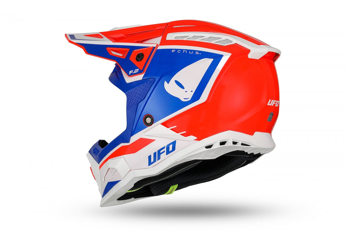 Casco motocross Echus Ufo Plast: conforme alla normativa ECE 22.06, è realizzato in HPF (High Performance Fiberglass) per massima sicurezza e resistenza. Offre ventilazione avanzata, interni traspiranti e lavabili, campo visivo ampio e sistema di emergenza ESS. Leggero, confortevole e compatibile con Neck Brace, è ideale per l’off-road estremo.